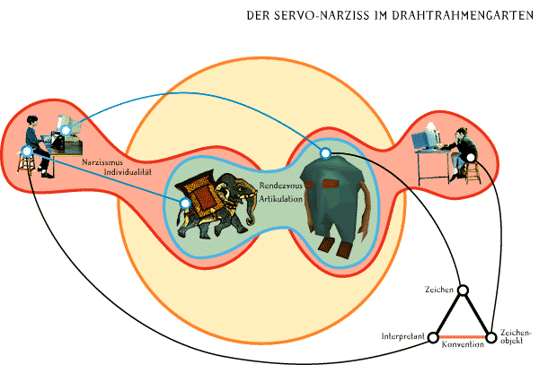 Servo-Narziss im Drahtrahmengarten ist der Repräsentant des Ichs. Es ist die Stelle im elektronisch generierten Raum, an der alles Menschen-Mögliche passieren kann (Hallo, hier kannst du ein Gespräch beginnen !). Das UserIcon ist der Punkt der erhöhten Kommunikationswahrscheinlichkeit. Es ist vor allem ein Zeichen in beliebiger Gestalt, ein Zeichen für die Anwesenheit von Leben im Datenraum. Das UserIcon sollte eine ganze Reihe von Signalen an seine Umwelt aussenden können, um die Aktionen des ihn steuernden Menschen im virtuellen Raum sichtbar zu machen. Doch wie wird diese Artikulation wahrgenommen ? Mit dieser Frage beginnt der letzte Teil der Beobachtungen, der dritte Kreislauf, namentlich das Rendezvous, der durch ein elektronisches Medium vermittelte Transport aller Äusserungen und des Äusseren, und die Wahrnehmung dieser Information durch einen Anderen.